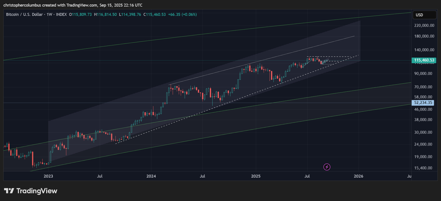 While the previous two articles over the past month were focused on the consolidation in Bitcoin price, that looks to have run its course, this article will look to sketch out the possible coming move up that has been expected for sometime. It will also explore whether or not that move must be restricted to the 4th quarter or not, whether it may also stretch into next year. Of course, these speculations, never a certainty, are based both on a multi-year bull market and where price is currently located in the model of logarithmic growth curve. Though speculative in nature, there is also some rationality to them resulting in a confident hold based on the technicals as opposed to a blind gamble. And so to the chart.
