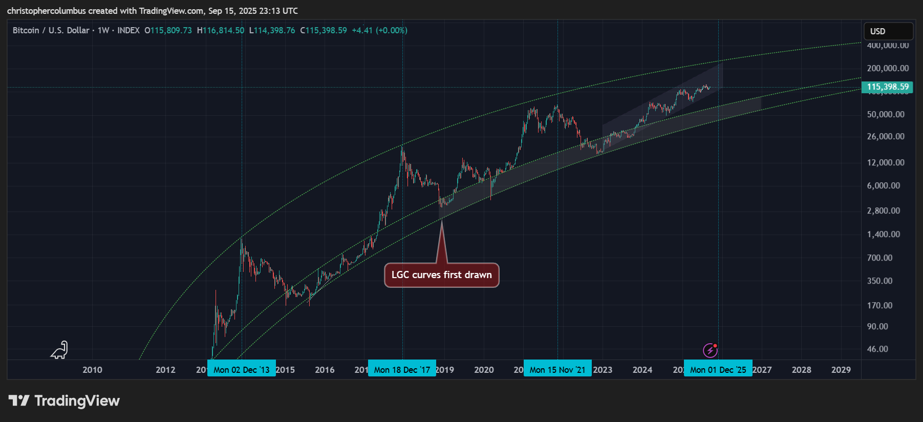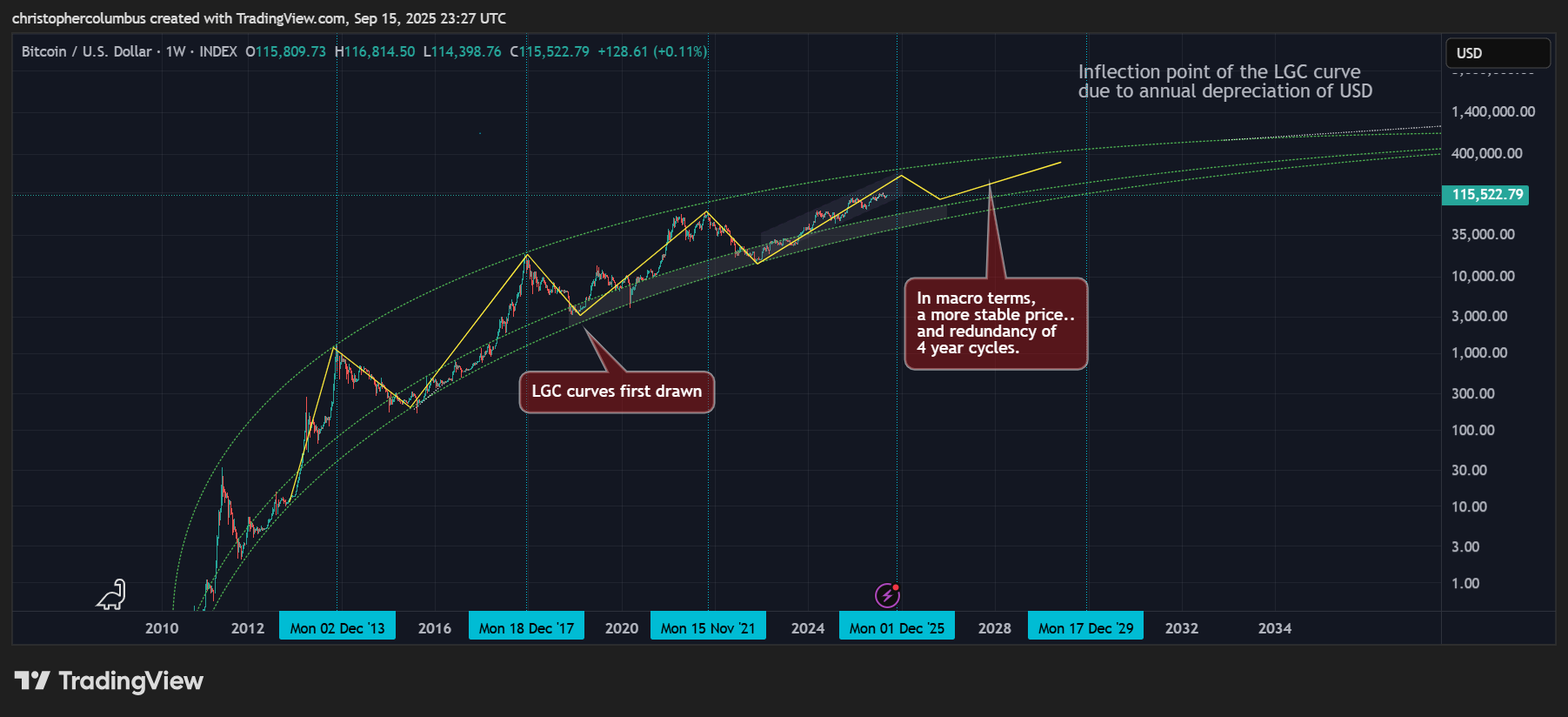 While the current technical channel continues to look solid, there are two ways in which the 4 year cycle could, strictly speaking, be invalidated - a rolling over of price before another peak [less likely] and a continuation of price higher [remaining elevated in LGC terms] early next year [more likely]. Either way, the LGC would remain and should remain going forward when 4 year cycles become a thing of the past.