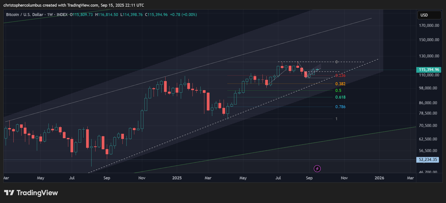 On zooming out a little, we can see that price continues to remain remarkably technical…. as if the market were maturing from one that was typified by extreme volatility, parabolic moves, and subsequent collapses, to one more stable and technical. And this was always to be expected, was indeed predicted in the notion of a maturing market well before this price action has served to validate that thesis.