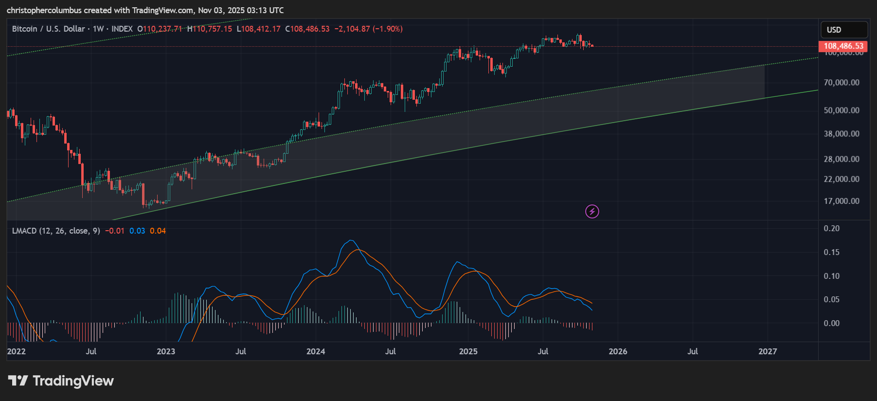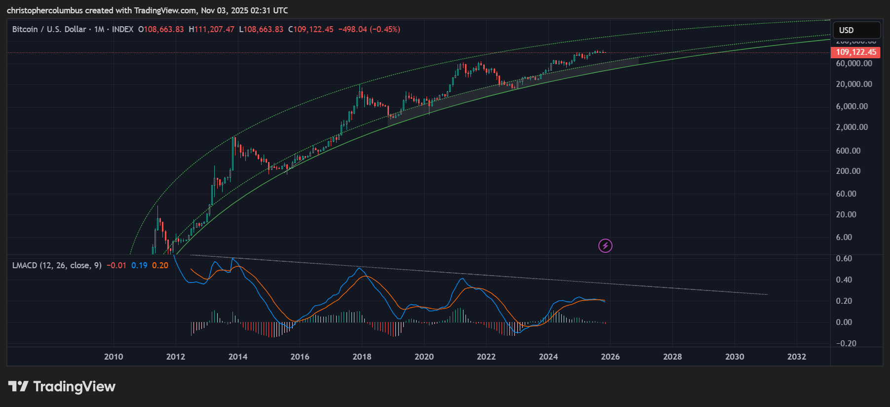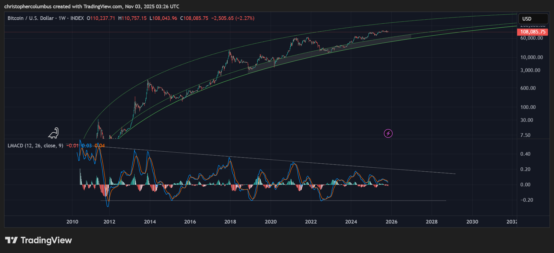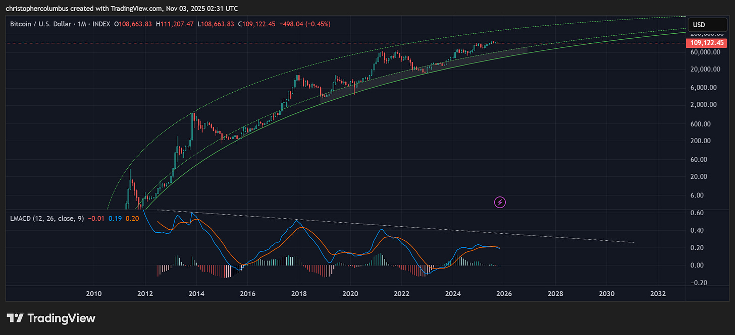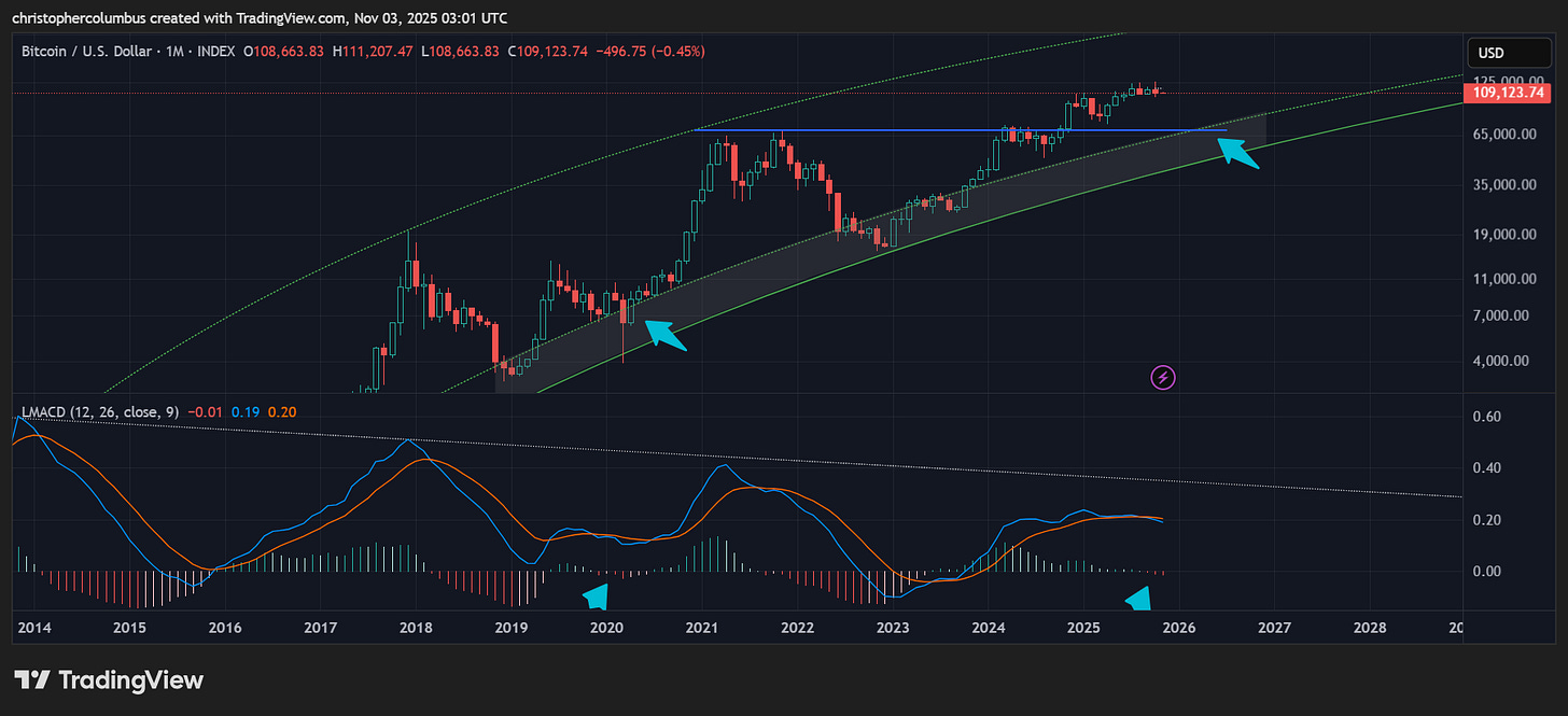 In my opinion, the chart above is signaling relative price stability [compared to other cycles]. It is also signaling price rolling over with a change in momentum while the MACD remains in bull territory [above the zero-line]. I think the closest MACD comparison to make here would be with 2020, where price rolls over without much extension in the histograms [and where price is midway in the channel] that come with the parabolic rise and the subsequent precipitous decline.