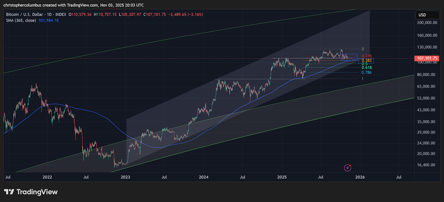 A remarkably stable price structure at the current elevated prices. Because this is something so novel to the history of the BTC market, it is creating some anxiety… but keep in mind, bull markets like to climb a wall of worry. The crucial metric to have in mind here is the 1 year moving average, which is currently 100K.