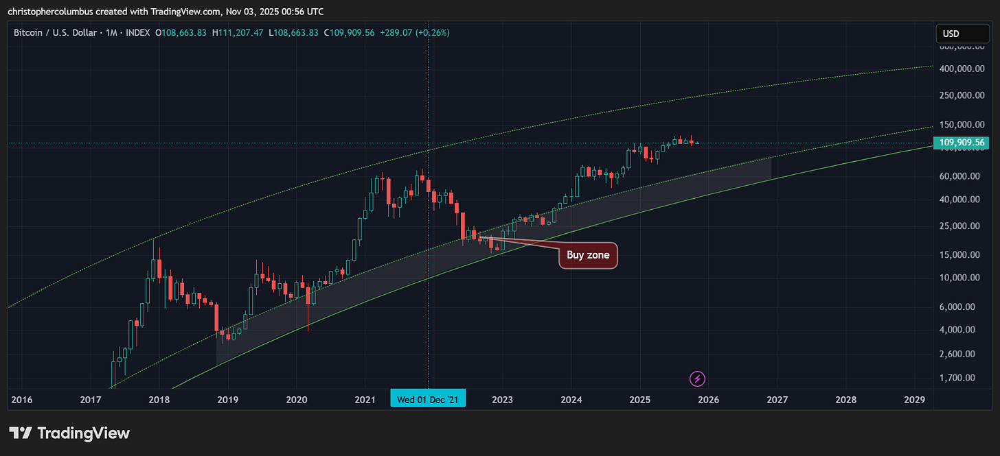 Over a coffee this morning, my niece asked me about Bitcoin. A few years back at a Christmas party, at the peak prices of 2021, her and her partner had naturally also asked about Bitcoin. My advice back then was to wait and buy the buyzone [suggesting 20K USD]… explaining the below logarithmic growth curve channel. This they did… though they decided to buy Ethereum instead [not too bad, still up 3x].