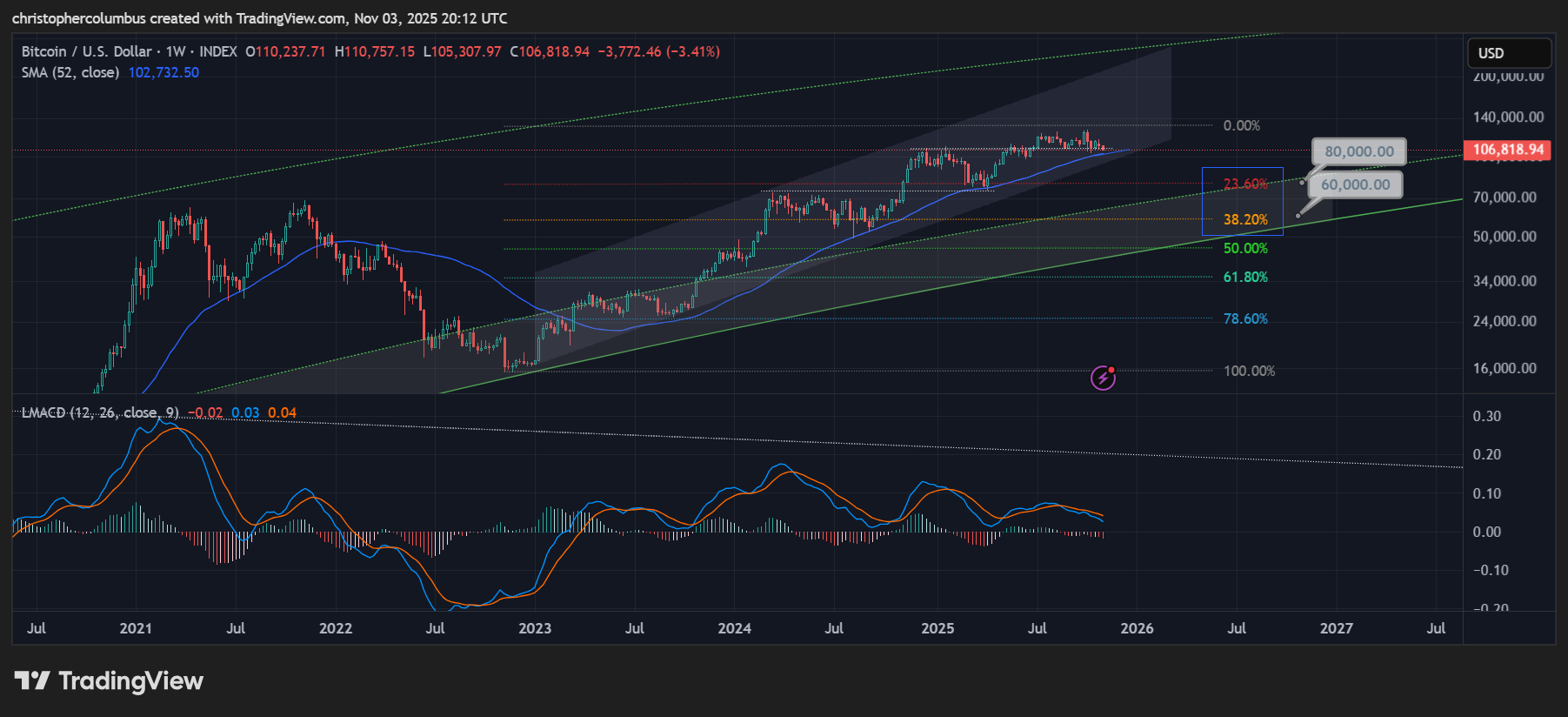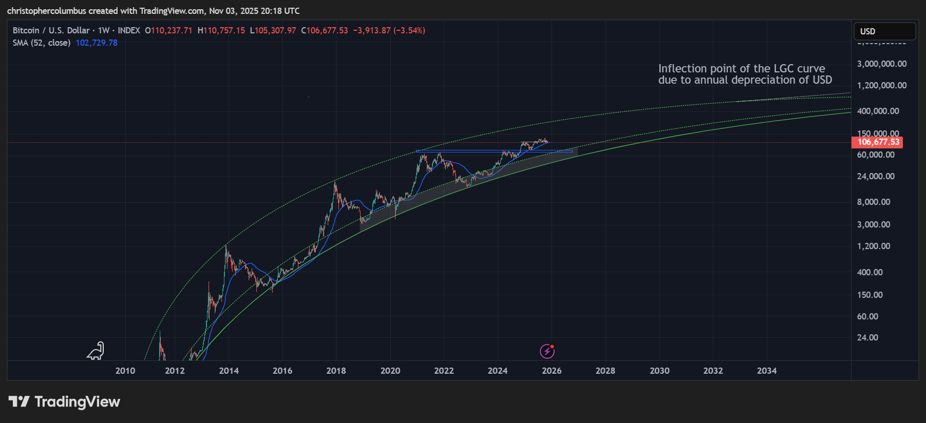 Price back to the buyzone [between a 23 and 38% real correction of the entire multi-year ascent] would see price back to somewhere between 80 and 60K. From there it would steadily head back up again based on the logic of the LGC channel, the predictions of which have held good since 2018.