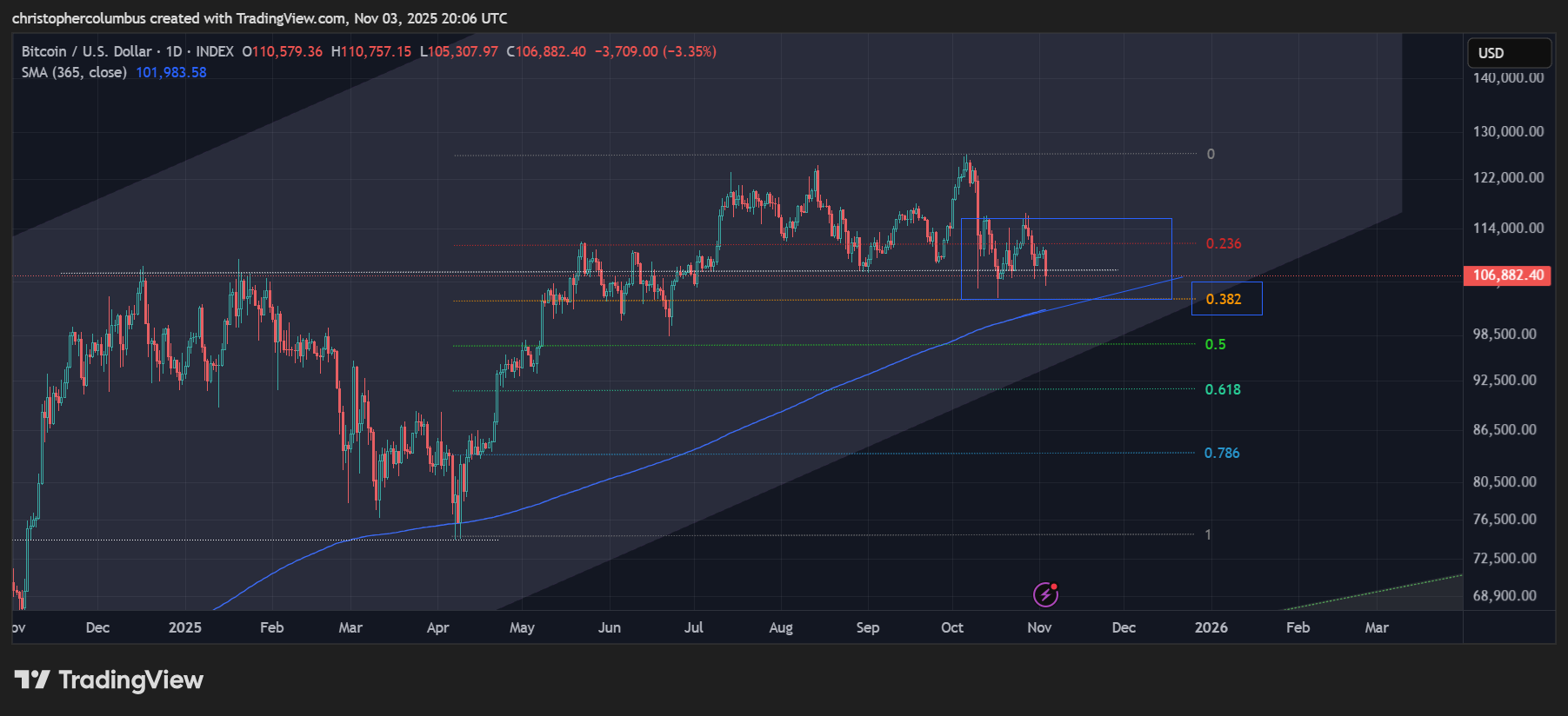 The question is whether this is signaling a transition from a parabolic market to a more mature one and increasing price stability, or whether this is signaling a loss of macro momentum and a coming period of consolidation back to the buy zone.