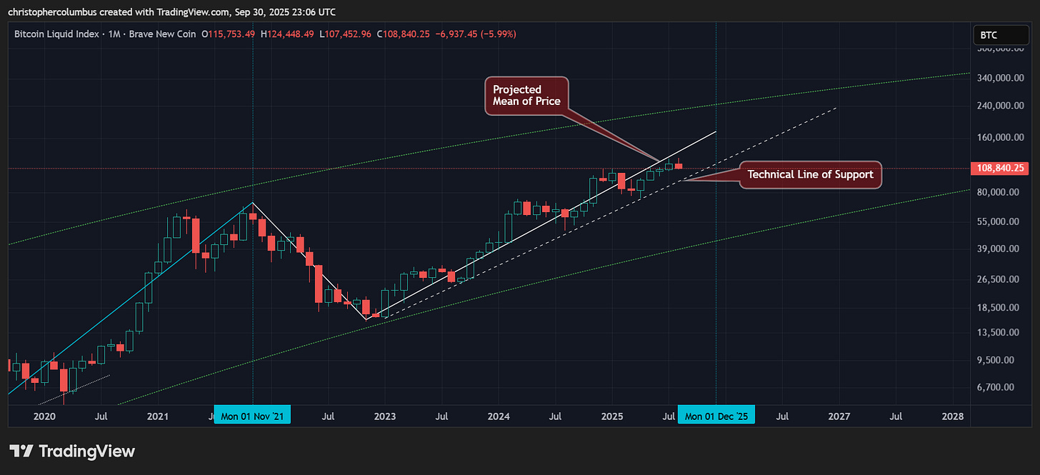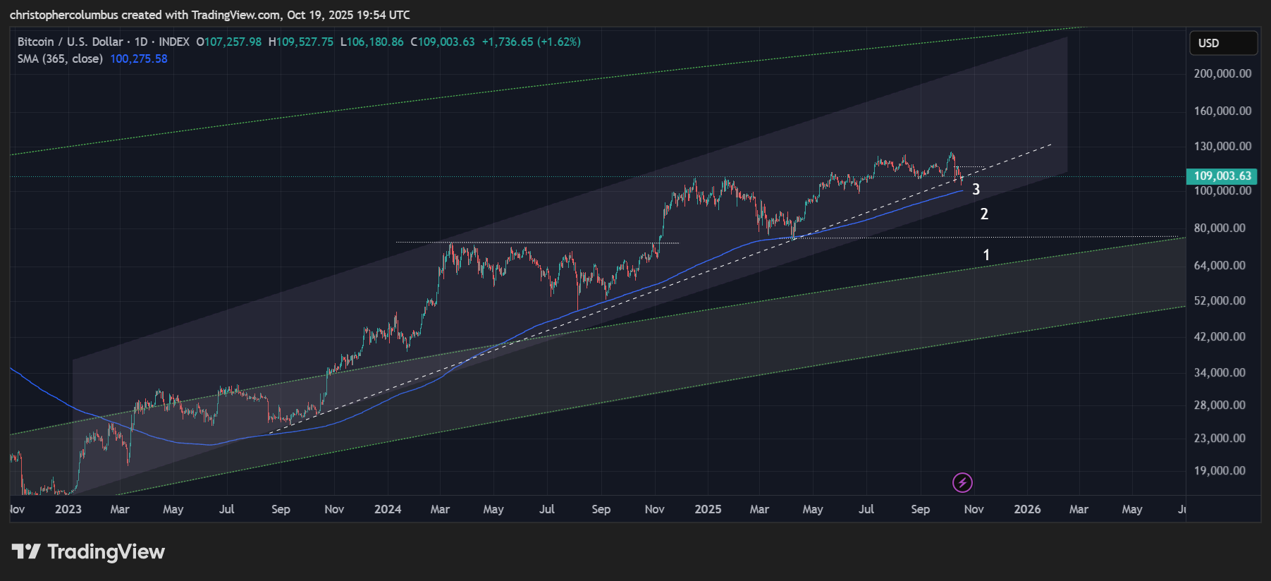 - 3 - Price through multi-year diagonal support. And here alarm might begin to register [signified by the larger 3 on the chart], and where price would be through the 100k mark