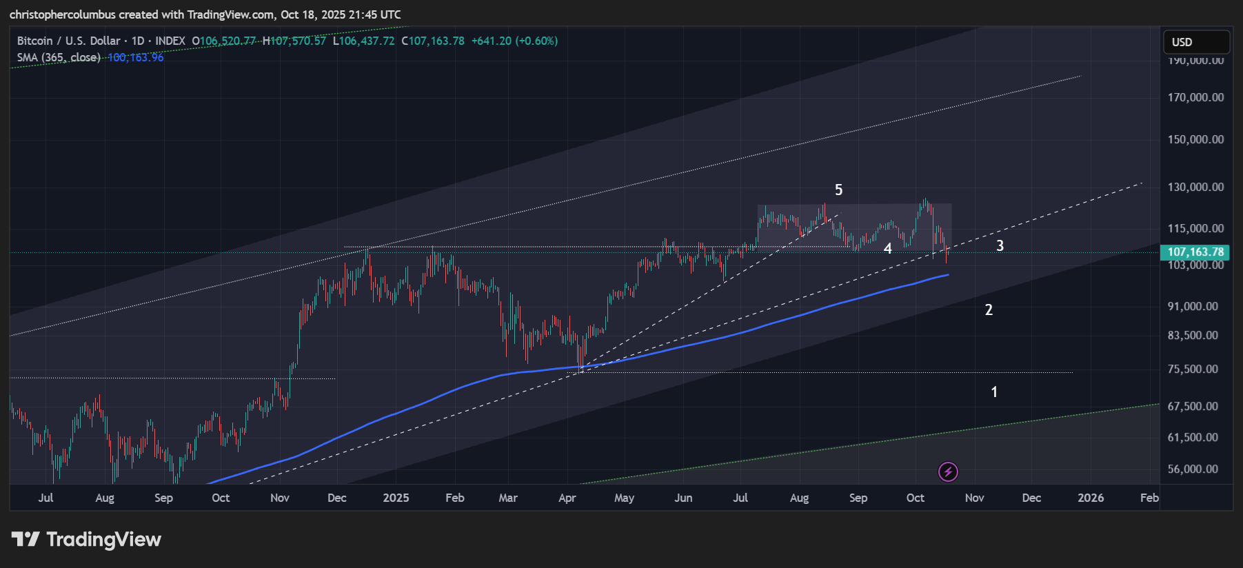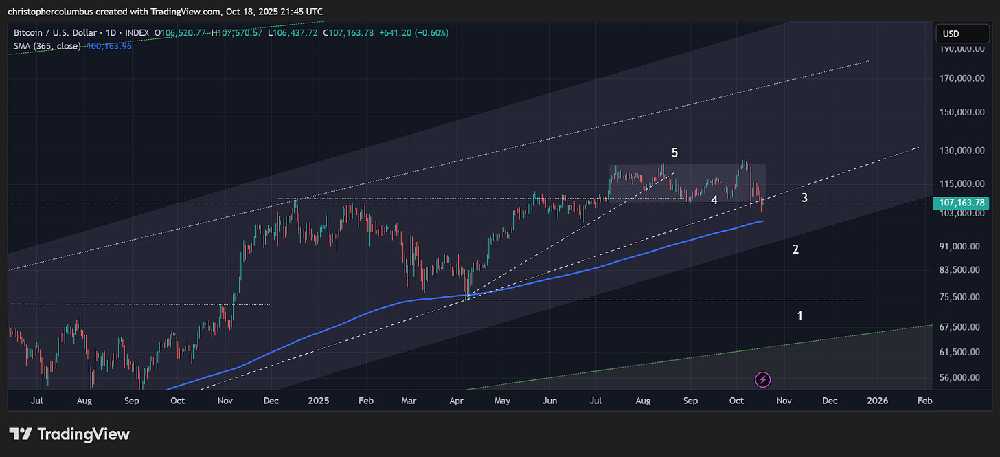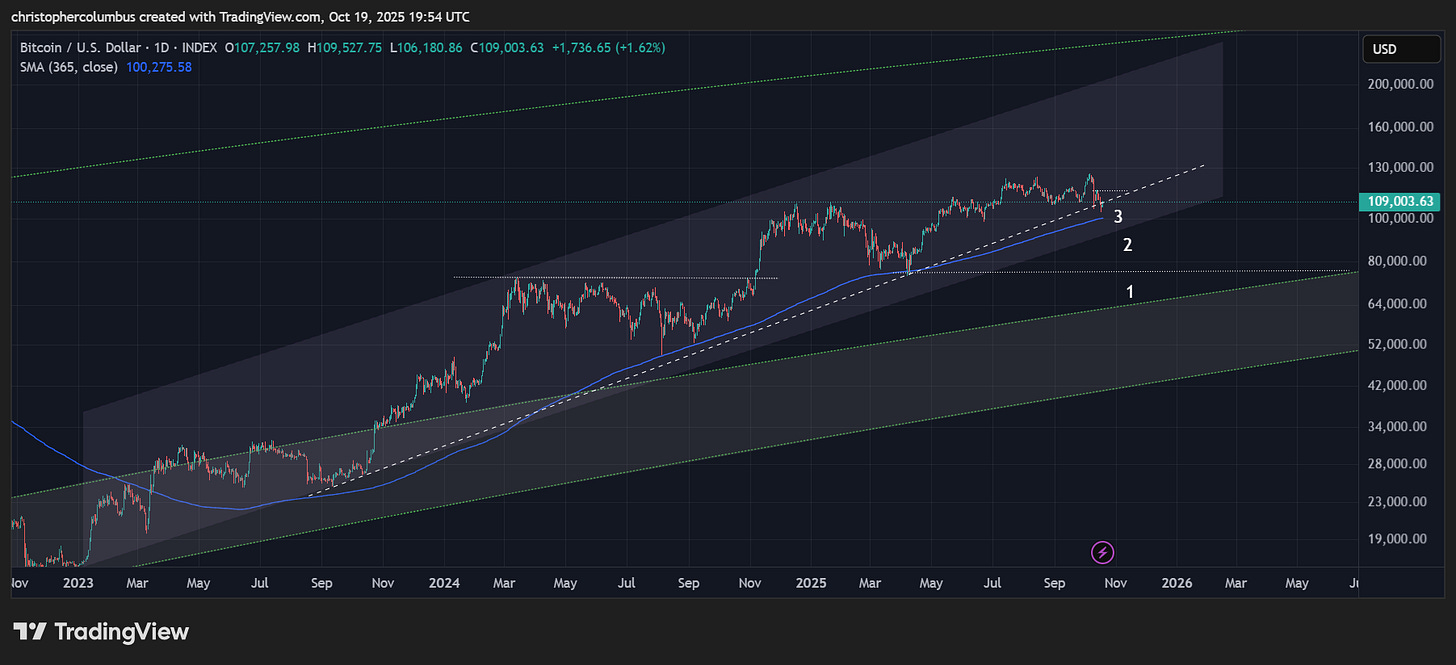 Looking at the chart itself, and without the assumption of a 4 year cycle, we see price now hitting longer-term support. In particular it is meeting both the longer-term multi-year diagonal, the 1 year moving average and the psychological significant 100K. In our ‘DEFCON’ system above, this is Level 3, which calls for readiness - readiness to start reducing trading exposure should that level be lost.