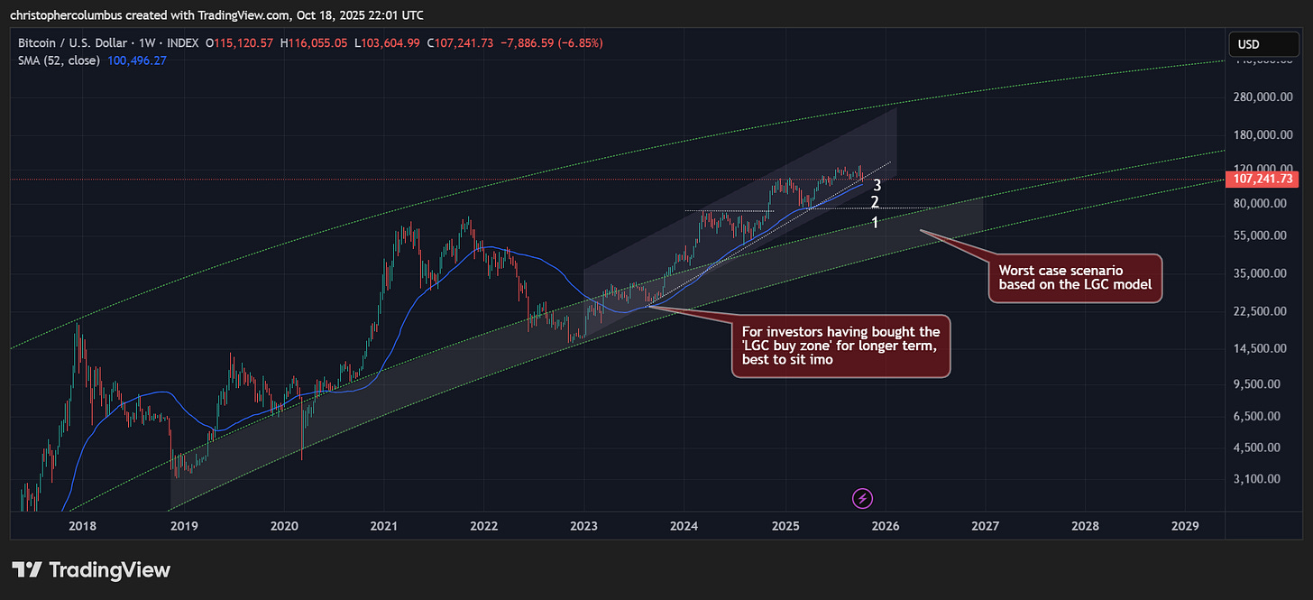 Zooming out in order to provide a more macro perspective for investors and holders, price in a maturing market has been relatively stable as compared to past cycles with price currently only midway in the LGC channel…which raises another point.