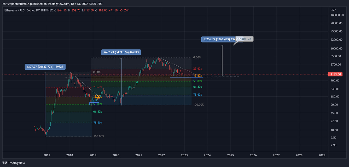 On the face of it, on the reading of the fib levels of the comparative retracements, the current correction is commensurate with the previous - presently we have just over a 38% correction compared to the 50% previous. This provides some confidence that exponential returns will once again return to this asset class… though perhaps not to the same extent - just as the recent 54x return followed on from the previous 206x return, we should expect the next return [if it comes] to be somewhat less than 54x. To speculate, where 54 is roughly a quarter of 206, so 54 quartered might give a future 13x odd [1200%]. Of course, there is no pretensions to clairvoyance here, just a technical comparison… that some may even consider quite conservative.