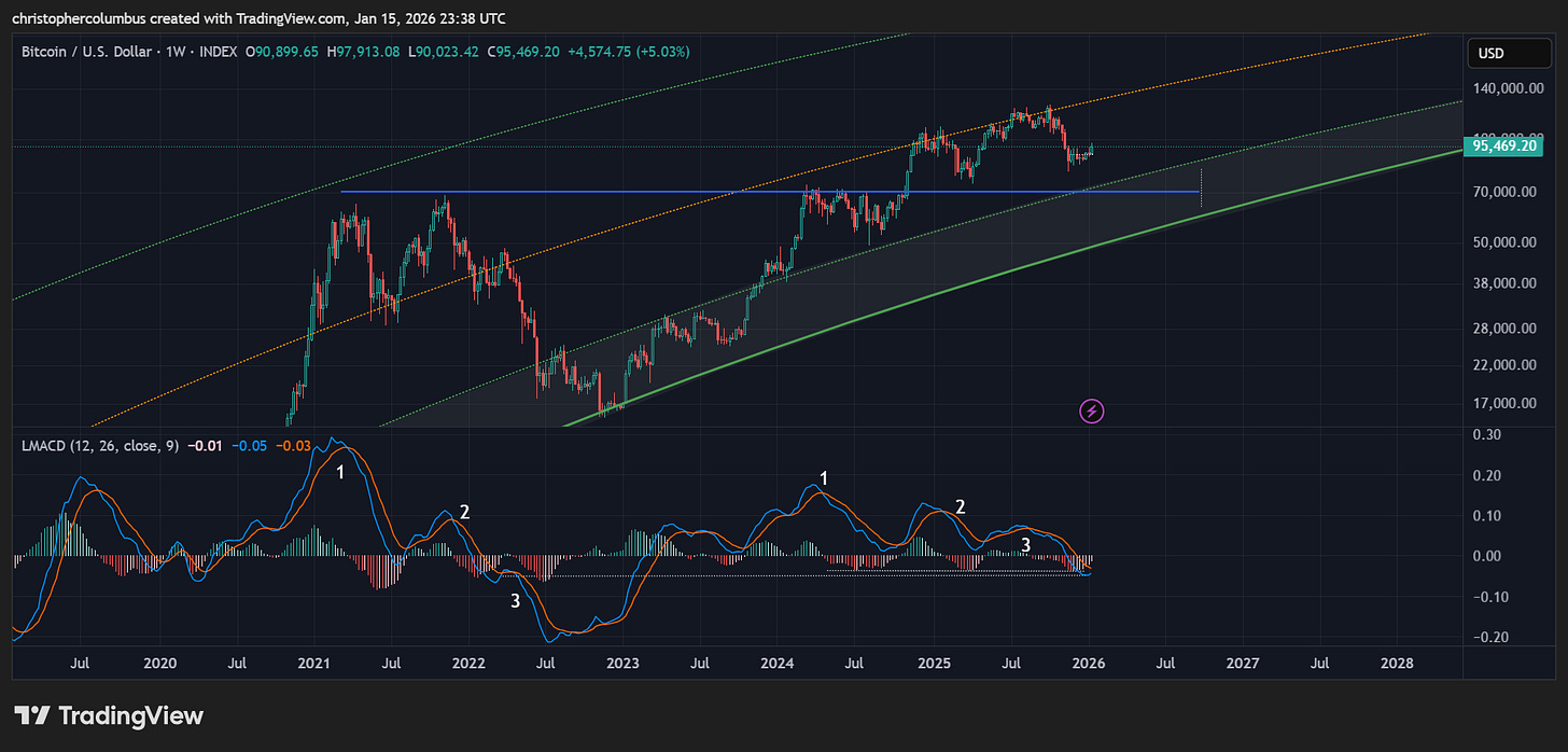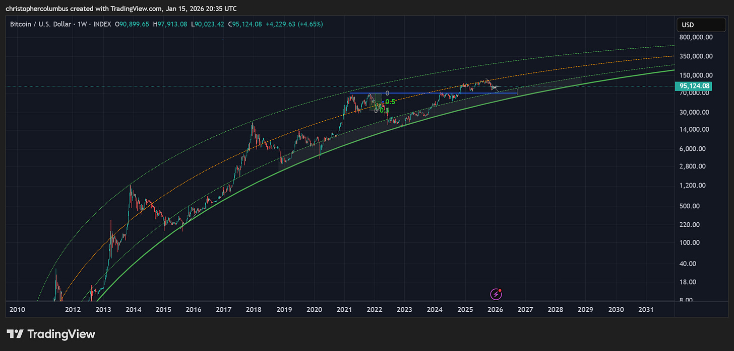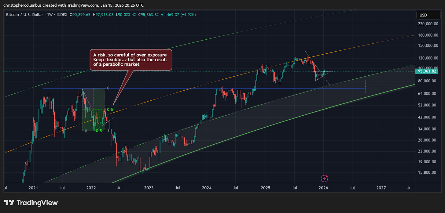 First of, with the first newsletter of 2026, Happy New Year to all! And it does seem a happier one for us Bitcoiners - after a multi-month correction, we now have printed on the chart a multi-month basing pattern. Price has held up well after the 4th quarter correction that panned out instead of the 4th quarter fireworks. One positive of this is we remain in a technically solid market as opposed to a parabolic blow-off… with its concomitant one year correction [does this suit long-term investors more… increasing stability?]. Accordingly, given the more technical nature of the market, the correction may have played out. Though this is not a certainty, it does function to distance ourselves from the assumption that a 1-year-long correction must play out.