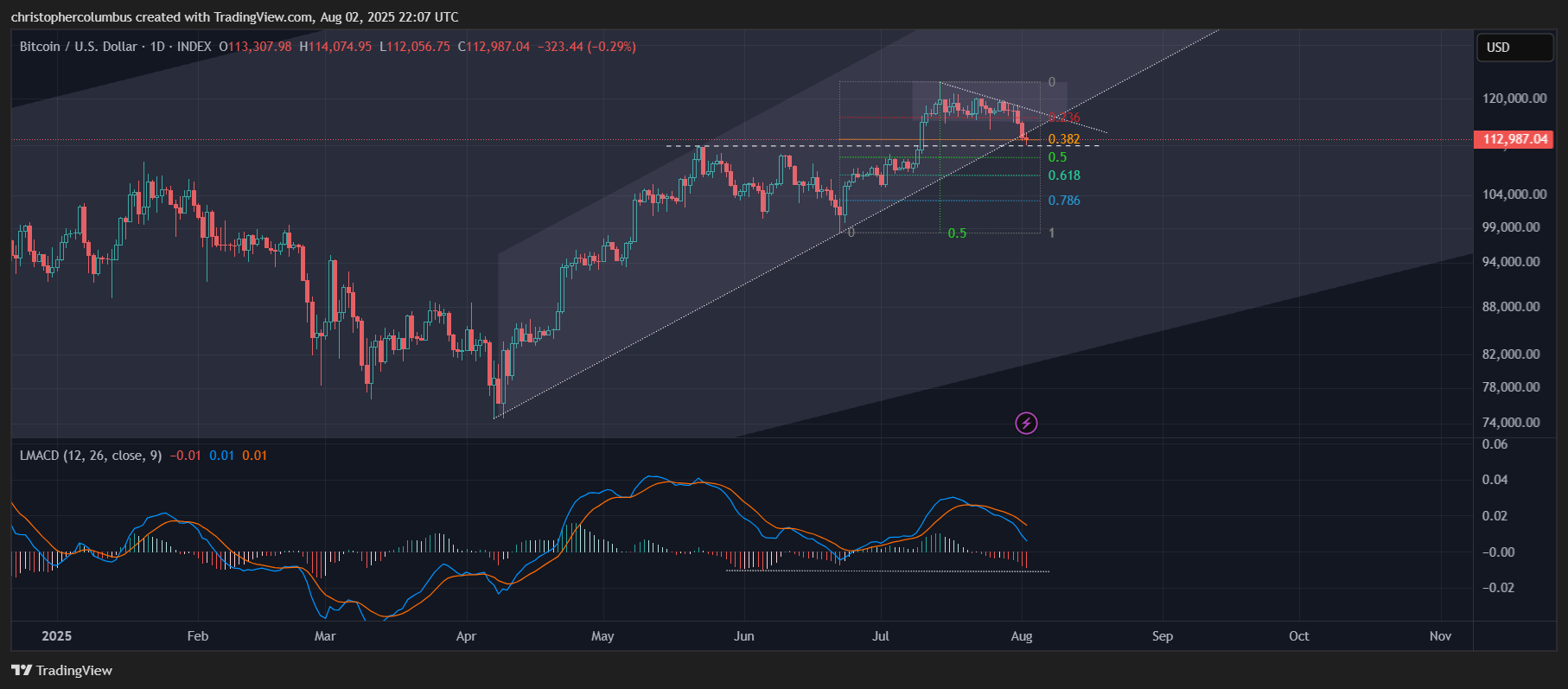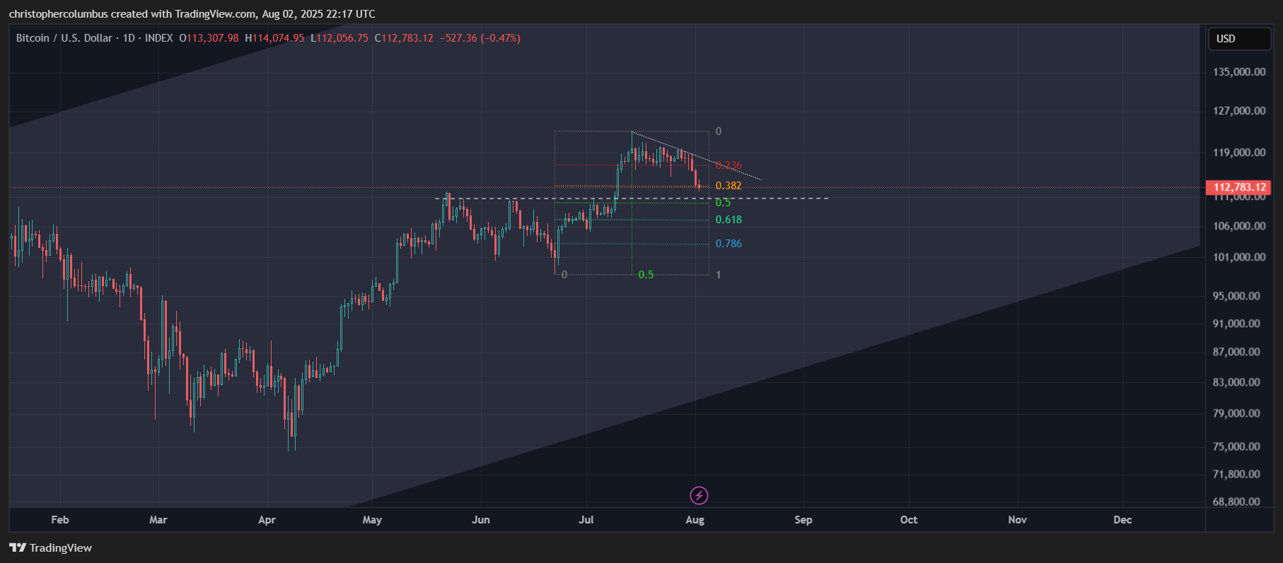 And there was the correction to 112k that I was looking for as based on a 38% real correction of the recent move and price coming back to a significant resistance come support level. Can price go a little lower? Sure, but at around these levels it’s reasonable to think support is there for another move up as will be seen by the technicals below. Also of note is that the current consolidation is as long as the previous move up.