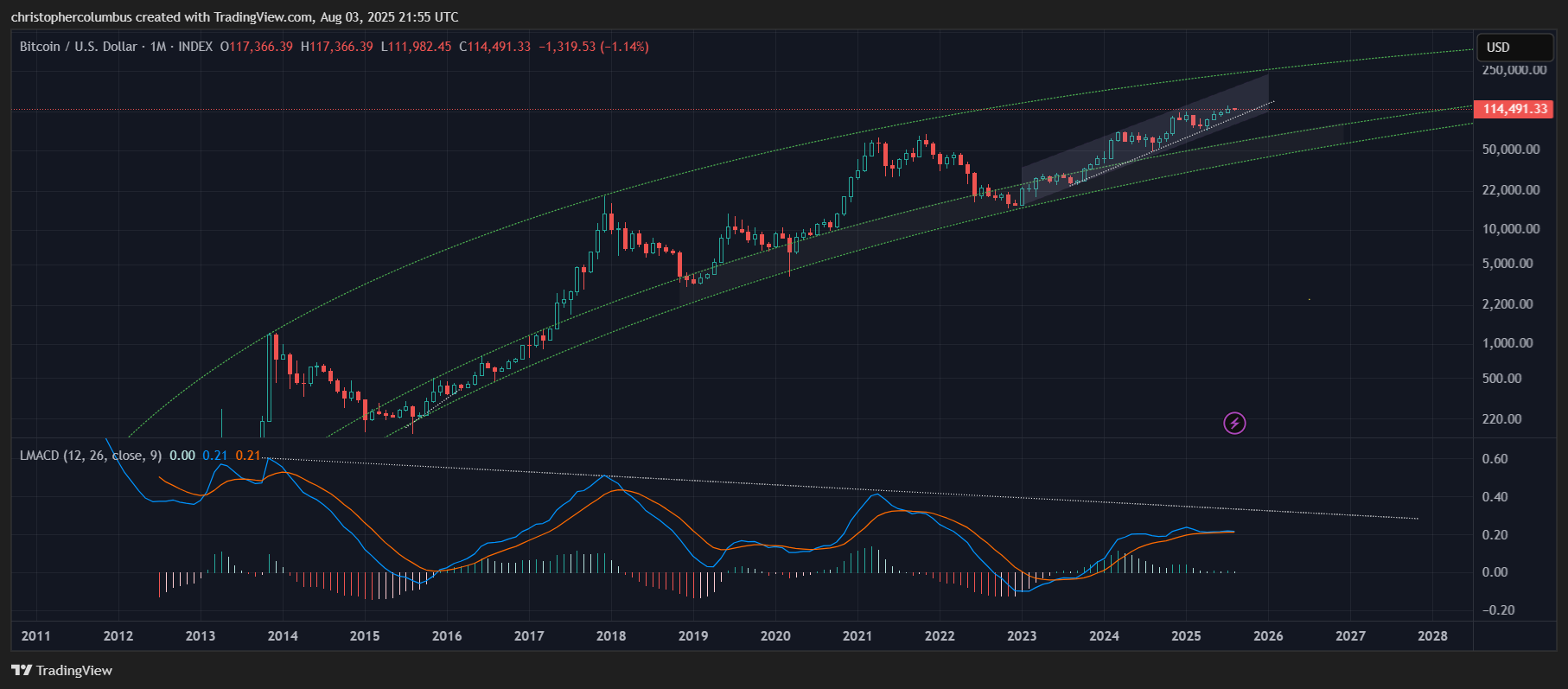 The conservative technical target of 160k by year’s end remains intact, and as supported by the momentum indicators of the log MACD on the longer-term charts. That target could well be exceeded in a renewed manic market as per the previous article.