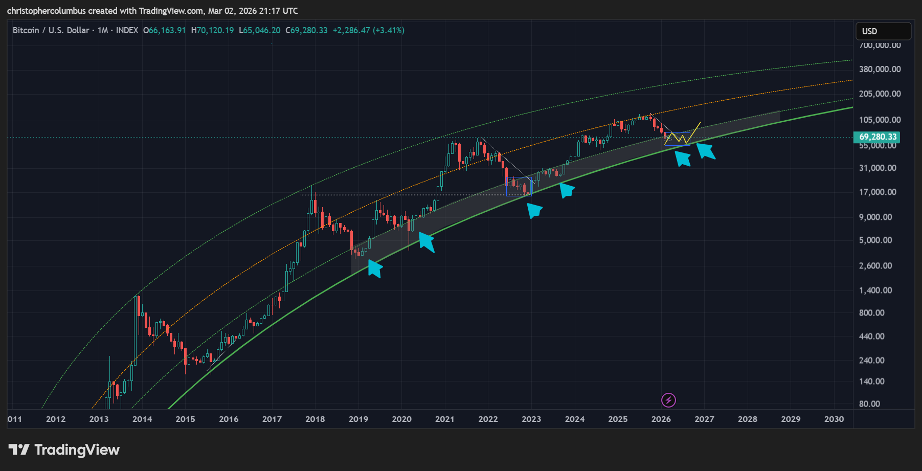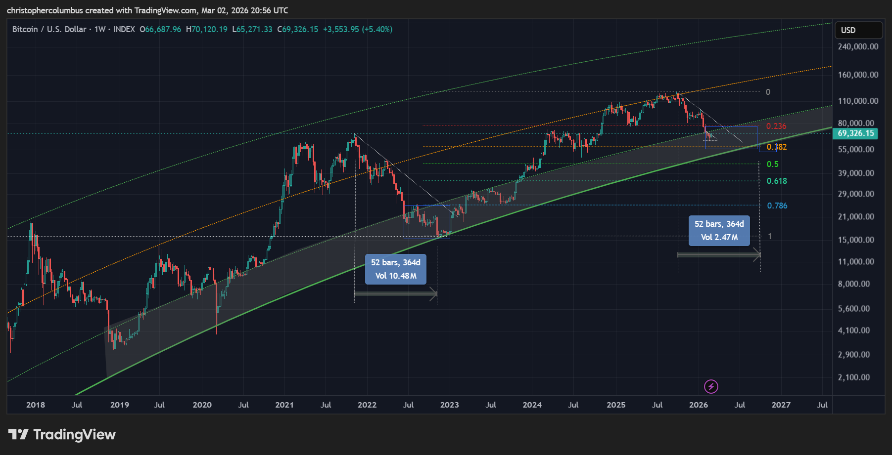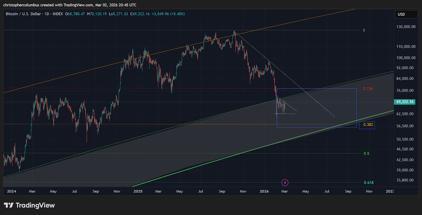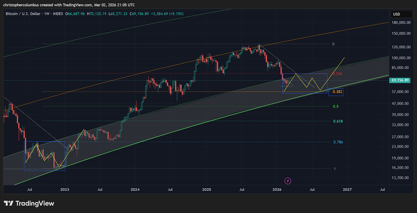 Something to keep in mind here is that price is now in the ‘buy zone’ according to the LGC model that has held true since 2018. This is the area in which previous investors [and for that matter traders] have done the best. The investor who has bought and held a core position continues to do well despite the macro corrections [as marked by the blue arrows]. These periods have also naturally been the periods of maximum fear and FUD.